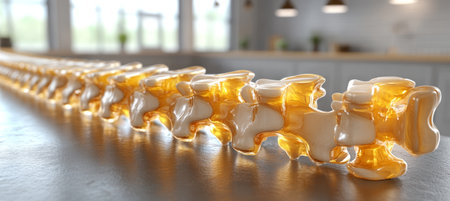 Crystal glass spinal column with flowing golden bio-fluid inside, chiropractic and energy concept. Focus on spine. Image created using generative AI.