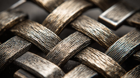 This close-up image captures the intricate details of a metallic woven texture, showcasing the interplay of light and shadow. Ideal for design projects.
