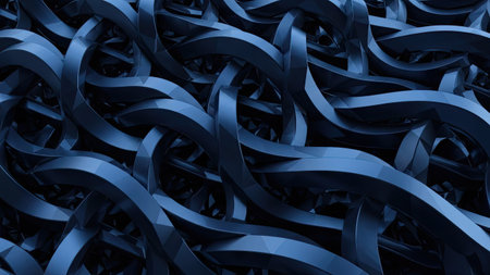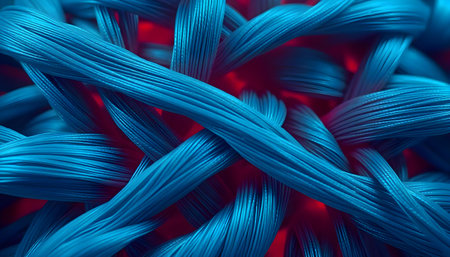 A detailed macro shot captures intertwined dark blue and black textured ropes. The foreground exhibits a precise weave, contrasted by a blurred background with blue light. AI-generated content