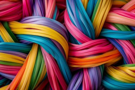 Close up of a bunch of colorful ribbons with intricate rainbow stripes intertwined, Intricate patterns of rainbow stripes intertwining and overlapping