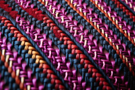 Intricate stitches in fabric from colored threads. AI generated illustration
