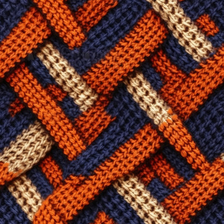 Close-up of blue and orange textured knitted yarn fabric pattern. That the image is generated using AI.