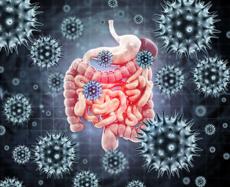 Human digestive system infected by virus or bacteria. 3d illustration