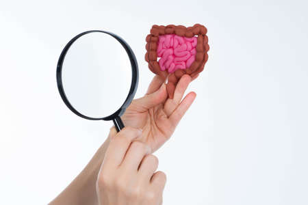 Person examines the gastrointestinal tract. Concept - study of human intestines. Doctor's hands with a magnifying glass. Examination of the gastrointestinal tract under a magnifying glass.