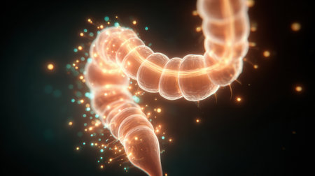 A Digital Rendering of a Human Intestine With Glowing Particles