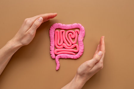 Human intestines colon organ shape with woman hands. Bowel disease concept
