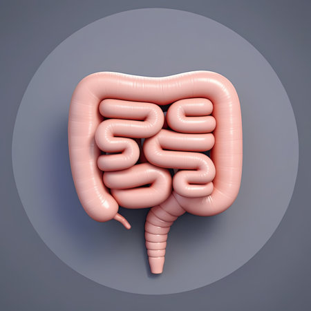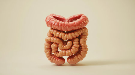 A D model of the human digestive system, including the stomach, intestines, and liver, set on a soft background with clear anatomical details