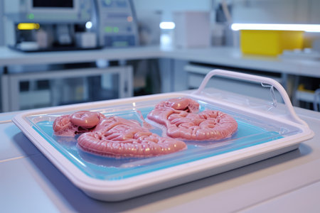 A mouthwatering assortment of food dishes arranged neatly on a tray, waiting to be enjoyed in the comfort of a kitchen, 3D printed organs on a medical tray, AI Generated