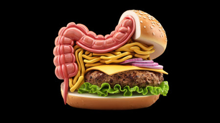 Human digestive system represented with burgers, fries, and pasta on transparent background