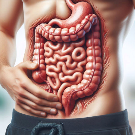A vibrant image of a human digestive system illustration, showing the entire digestive tract from the mouth to the intestines, with clear, labeled parts.