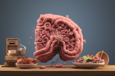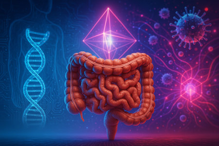 AI generated realistic image of large human intestine with glowing DNA digital structures and abstract biotech elements symbolizing futuristic medical analysis and bioinformation systems