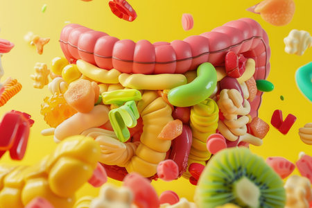 This vibrant 3D illustration showcases the human digestive system, creatively integrating fruits and vegetables to emphasize nutrition. Ideal for educational purposes.