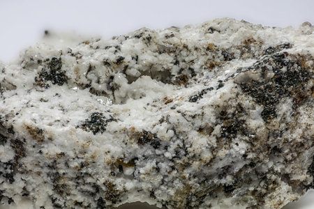 closeup of sample of natural mineral from geological collection - unpolished saccharoidal Apatite rock on white marble background from Khibiny, Kola Peninsula, Russia