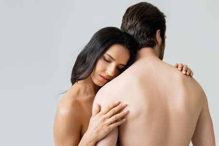 back view of shirtless man near sexy brunette woman hugging him isolated on grey