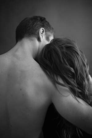 Black and white image of man hugging naked girl in shadows