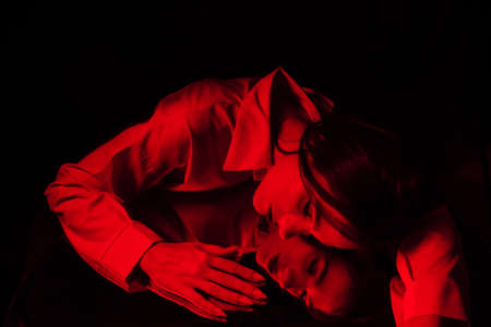 naked passionate man holding neck of girlfriend in red light isolated on black