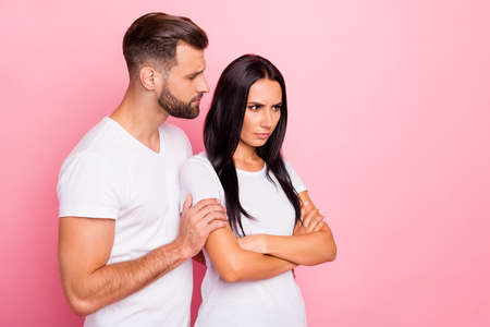 Portrait of his he her she two nice-looking attractive lovely sullen moody spouses, folded arms husband supporting wife family isolated over pink pastel background