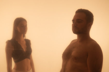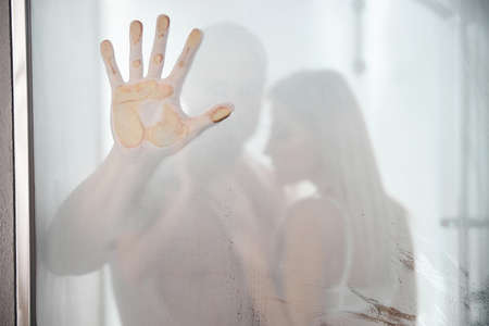 Silhouette of a couple through frosted glass or polyethylene wrap