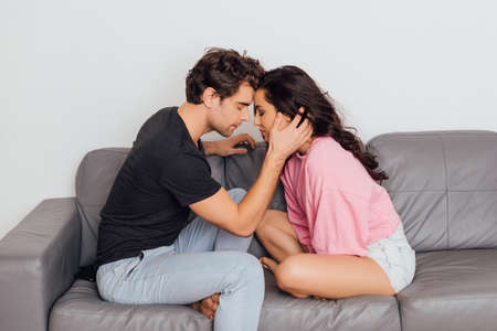 Side view of handsome man touching face of beautiful girlfriend on couch on gray background