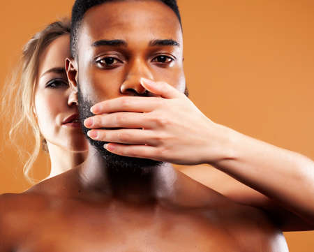 Young pretty couple diverse races together posing sensitive on brown background, lifestyle people concept