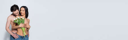 smiling woman in jeans only holding tulips near shirtless man on grey, banner