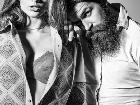 Young sensual couple of bearded handsome man with beard and pretty sexy girl or beautiful woman in red sexi bra on grey wall