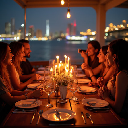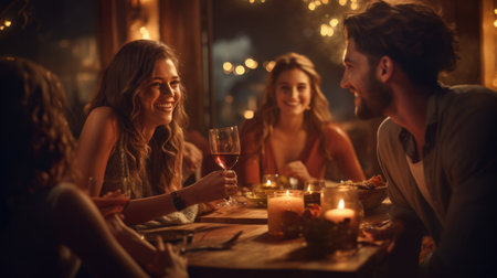 Diverse friends sharing a meal, laughing happily during an intimate dinner illuminated by a warm table lamp light