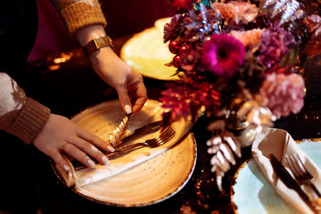 Table setting. Hands lay the napkin on the plate. Selected focus and blurred background.