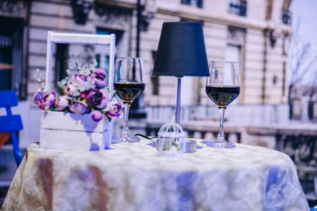 Table served for dinner in restaurant. Selective focus on wine glasses