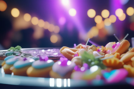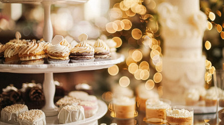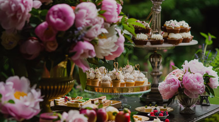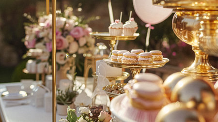 A festive dessert table with a variety of miniature treats, including cupcakes, cookies, and pastries. Generative AI