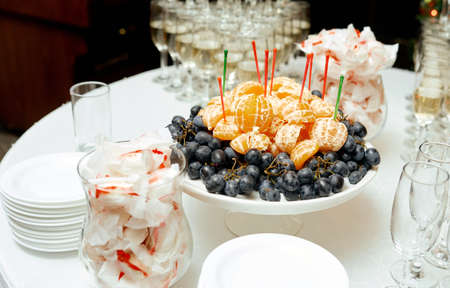 Table with food for the holiday. Cuisine. Culinary Buffet. Dinner Catering. Dining Food. Celebration Party. Concept wedding birthday. Sweet pastries desserts