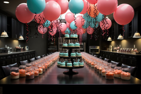 A festive dessert table is arranged with several decorated cakes and cupcakes. Pastel colors dominate the scene, including pink and blue. The composition includes balloons and decorative elements. This imagery is suitable for use in celebrations, events, or commercial projects requiring a celebratory aesthetic.