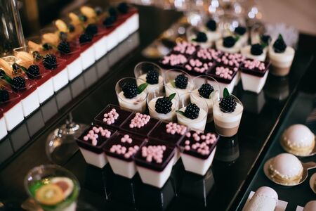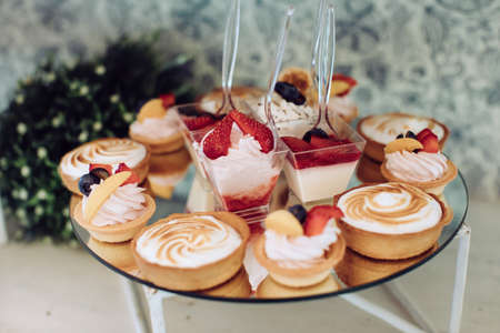 desserts with fruits, mousse, biscuits. Different types of sweet pastries, small colorful sweet cakes, macarons, and other desserts in the sweet buffet. candy bar for birthday