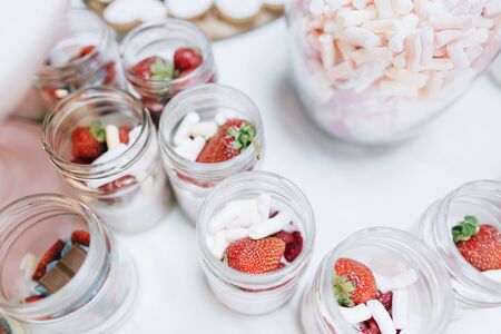 Dessert table with panna cotta, meringues and strawberry in white chocolate. Dessert. Dessert table. High quality photo