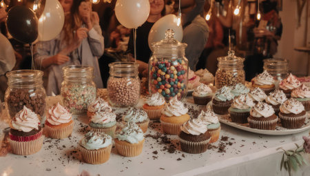 A delightful dessert table featuring an array of cupcakes and candy jars, perfect for a festive celebration with friends and family.