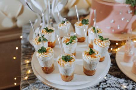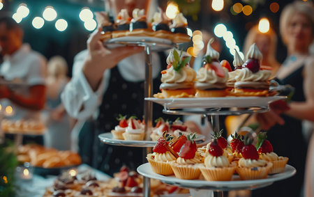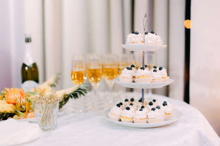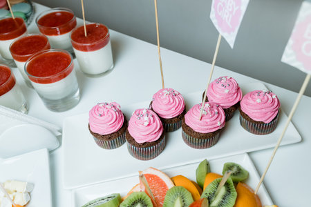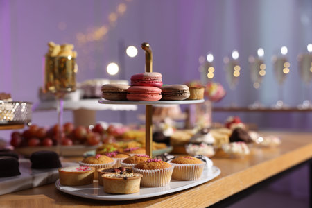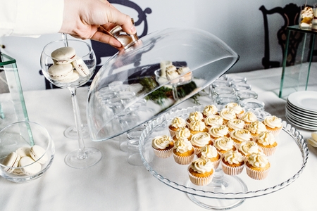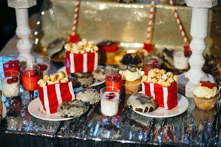 making cupcakes and pastries. Buffet table close-up. Tasty food