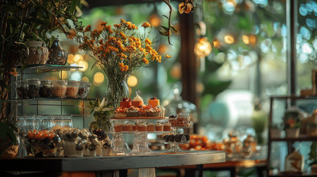 wedding reception, candy bar, dessert table with delicious cakes and cookies