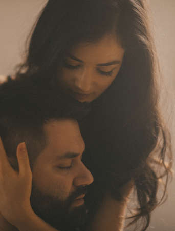 couple in love on the bed. hug each other. bare shoulders .love. passion