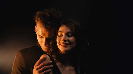 caring man standing behind and hugging happy woman on black