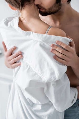 cropped view of shirtless man seducing girlfriend and taking off white shirt