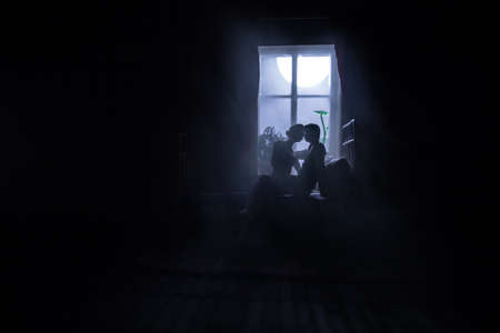 A realistic dollhouse bedroom with furniture and window at night. Romantic couple sitting on window. Man and woman making love in bedroom. Artwork table decoration. Selective focus.