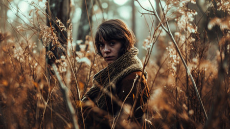 A Pensive Woman Wrapped in a Cozy Scarf Amid the Autumnal Foliage.