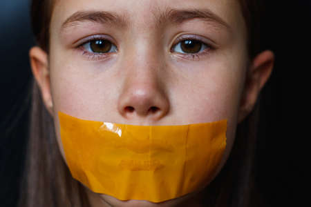 Unhappy girl with sticky tape over her mouth. Violation of human rights.