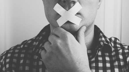 Man with mouth sealed in adhesive tape with Freedom message. Free of speech, freedom of press, Human rights, Protest dictatorship, democracy, liberty, equality and fraternity concepts