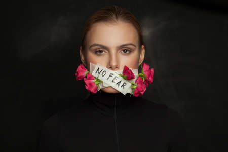 Strong woman with sealed mouth with No fear inscription