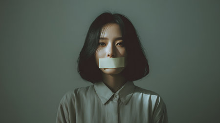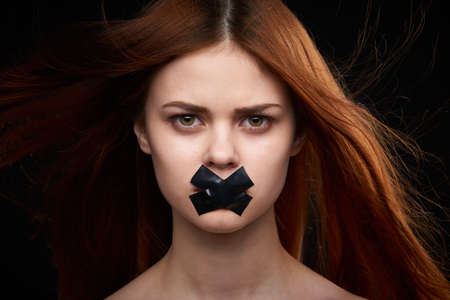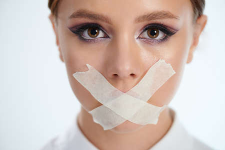 Woman with taped mouth. Silence and complicity in silence.