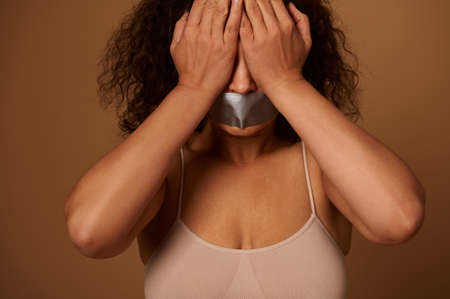 Social concept for helping to end and eliminate aggression and violence against women. Scared woman with sealed mouth covering her eyes with hands, isolated on dark beige background with copy space