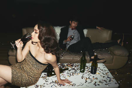 Drunk young woman with wine glass lying on floor after party