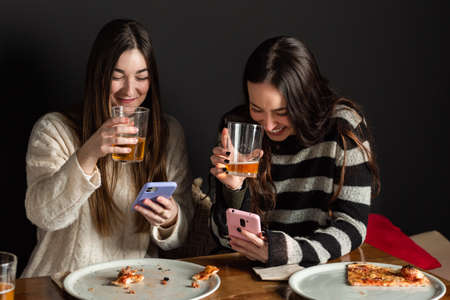two girls drinking beer, using mobile phones and eating pizza.