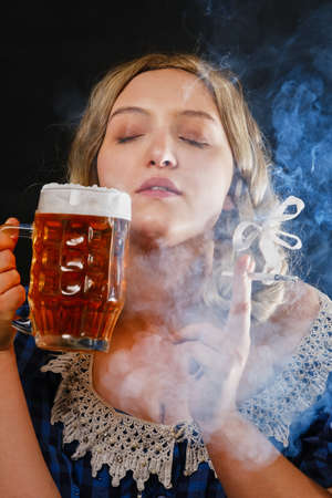 young woman in a blue dress with a mug of beer on a black background smoking